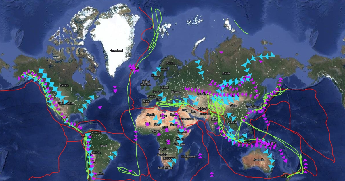 Map of tectonic plates, earthquwakes, volcanoes and mountains