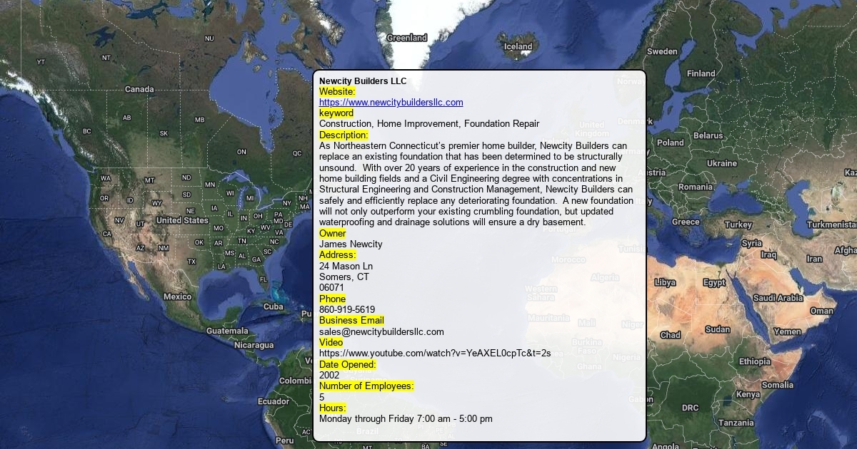 Website: https://www.newcitybuildersllc.com keyword Construction, Home Improvement, Foundation Repair Description: As Northeastern Connecticut’s premier home builder, Newcity Builders can replace an existing foundation that has been determined to be structurally unsound. With over 20 years of experience in the construction and new home building fields and a Civil Engineering degree with concentrations in Structural Engineering and Construction Management, Newcity Builders can safely and efficiently replace any deteriorating foundation. A new foundation will not only outperform your existing crumbling foundation, but updated waterproofing and drainage solutions will ensure a dry basement. Owner James Newcity Address: 24 Mason Ln Somers, CT 06071 Phone 860-919-5619 Business Email [email protected] Video https://www.youtube.com/watch?v=YeAXEL0cpTc&t=2s Hours: Monday through Friday 7:00 am - 5:00 pm