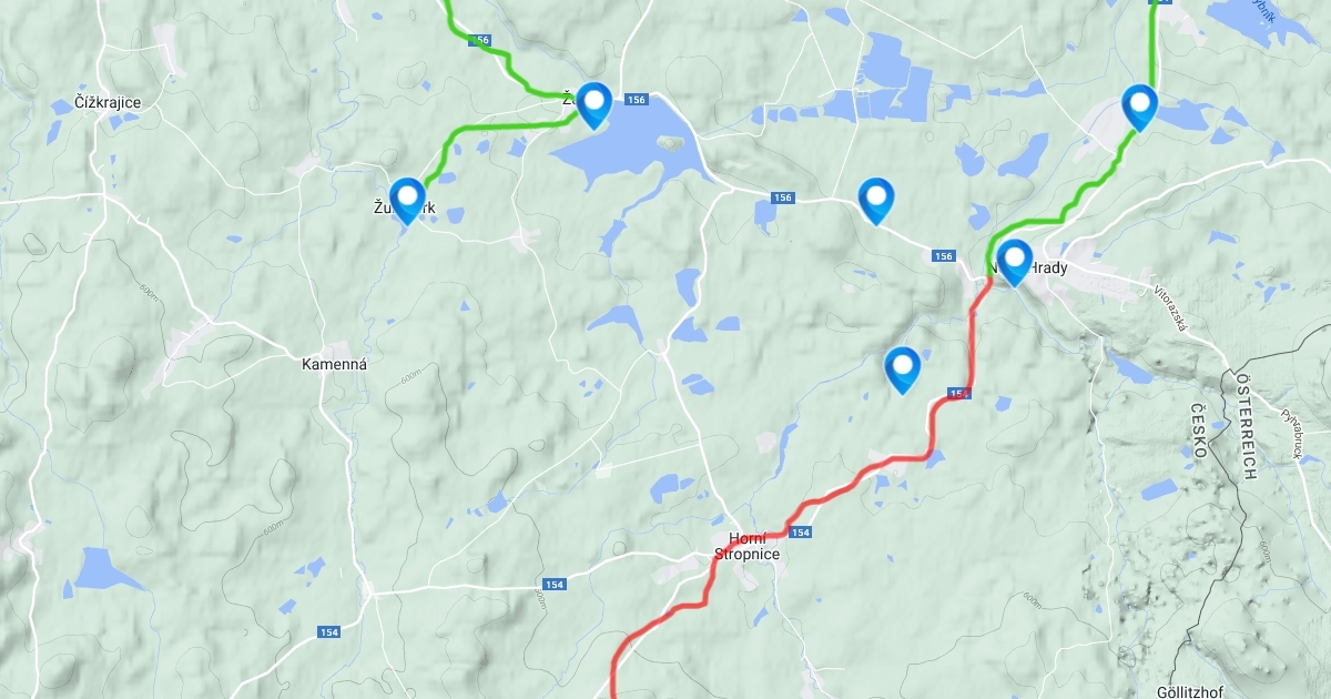 První den: (červená trasa) Baronův Most -> Huťský rybník -> Žofínský prales -> Hojná Voda + Kraví Hora -> Dobrá Voda -> Terčino Údolí -> Nové Hrady -> penzion Kamínek