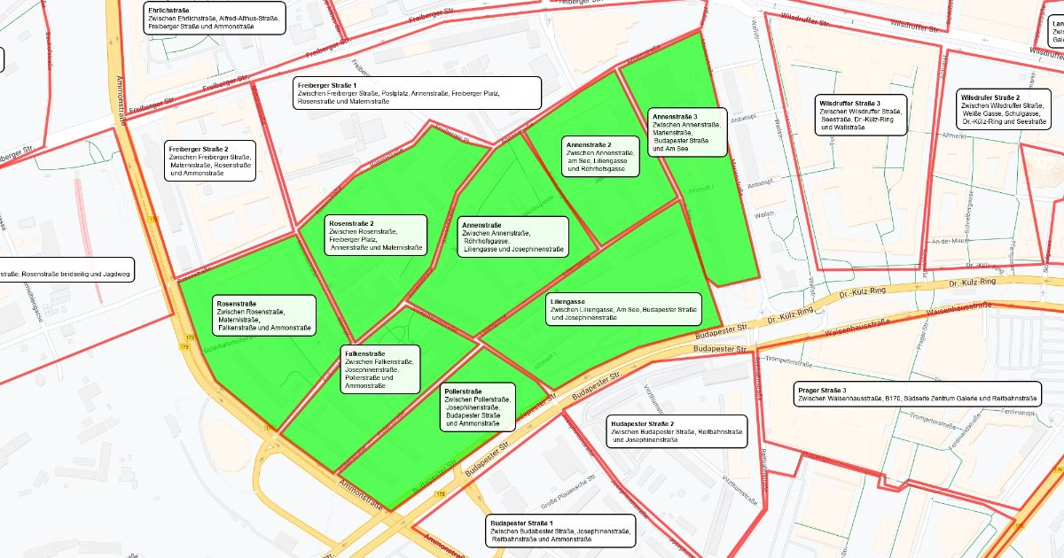 Alle Straßen im genannten Gebiet. Zuzüglich der, dem Gebiet zugewandten Straßenseiten der genannten Gebietsbegrenzungsstraßen. Gebiet weiß = frei, grün = Reserviert/Aktion abgeschlossen.