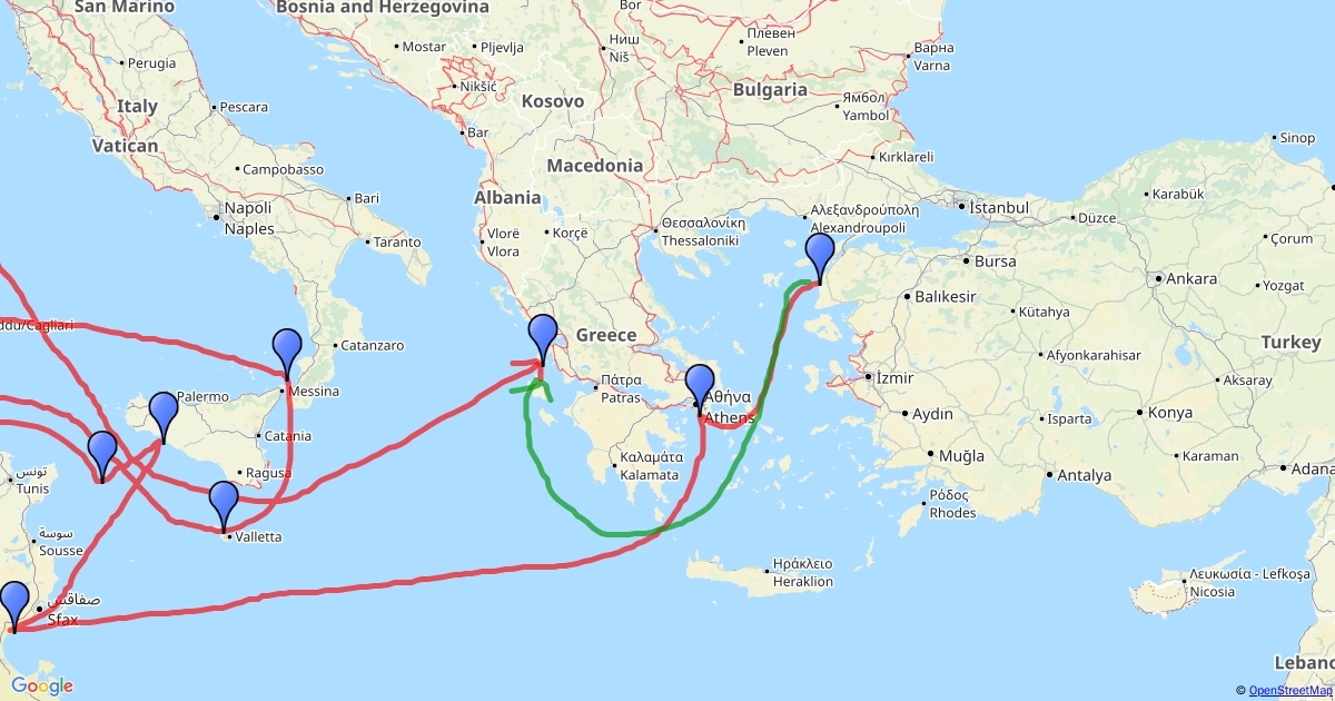 Odysseus' travels throughout the Mediterranean.