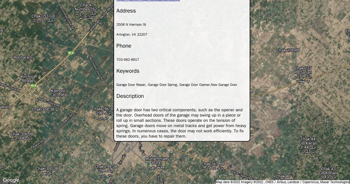 Website https://goo.gl/maps/e1XqvL3tvDJe6bcQ6 Address 2508 N Harrison St Arlington, VA 22207 Phone 703-682-8917 Keywords Garage Door Repair, Garage Door Spring, Garage Door Opener,New Garage Door Description A garage door has two critical components, such as the opener and the door. Overhead doors of the garage may swing up in a piece or roll up in small sections. These doors operate on the tension of spring. Garage doors move on metal tracks and get power from heavy springs. In numerous cases, the door may not work efficiently. To fix these doors, you have to repair them.