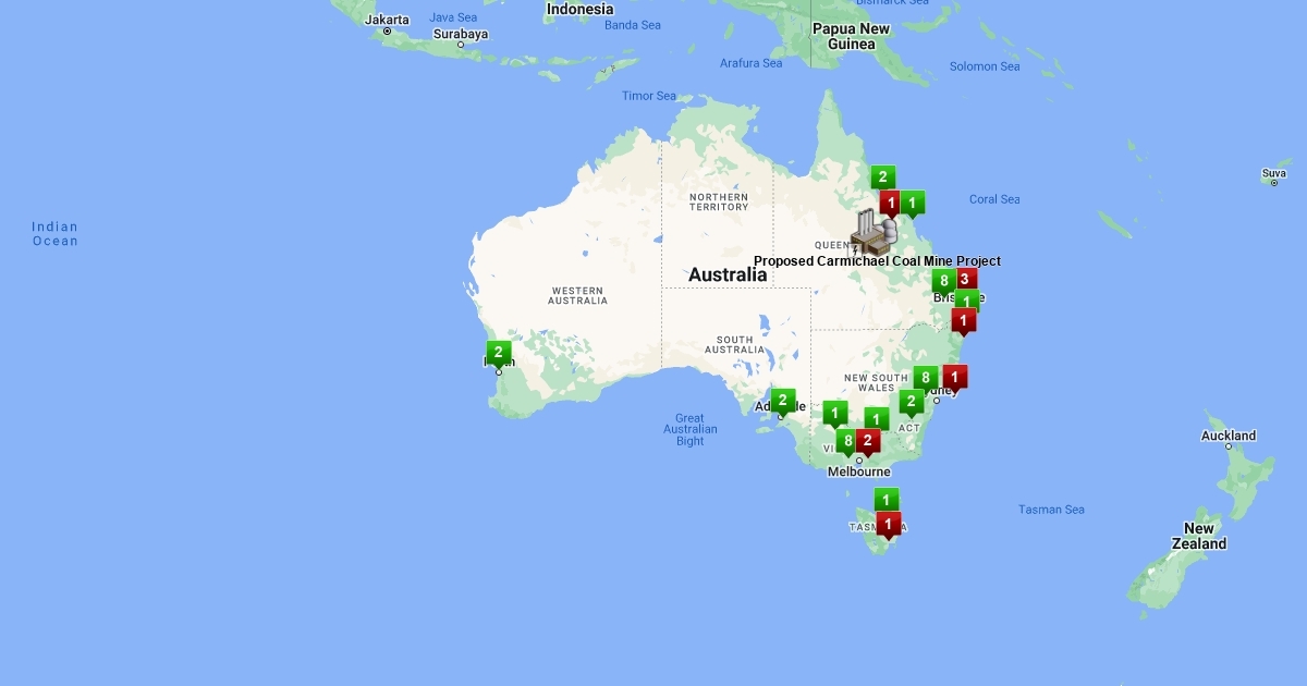 Map recording support and opposition to the Proposed Carmichael Coal Mine Project by Adani Australia, data recorded from Facebook