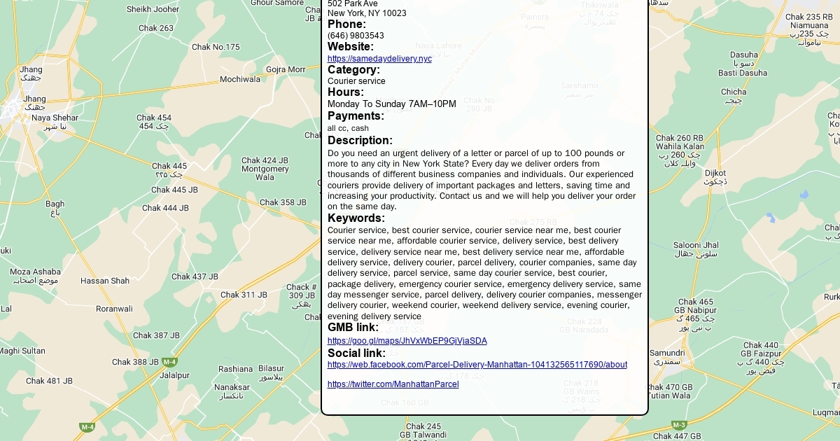Address: 502 Park Ave New York, NY 10023 Phone: (646) 9803543 Website: https://samedaydelivery.nyc Category: Courier service