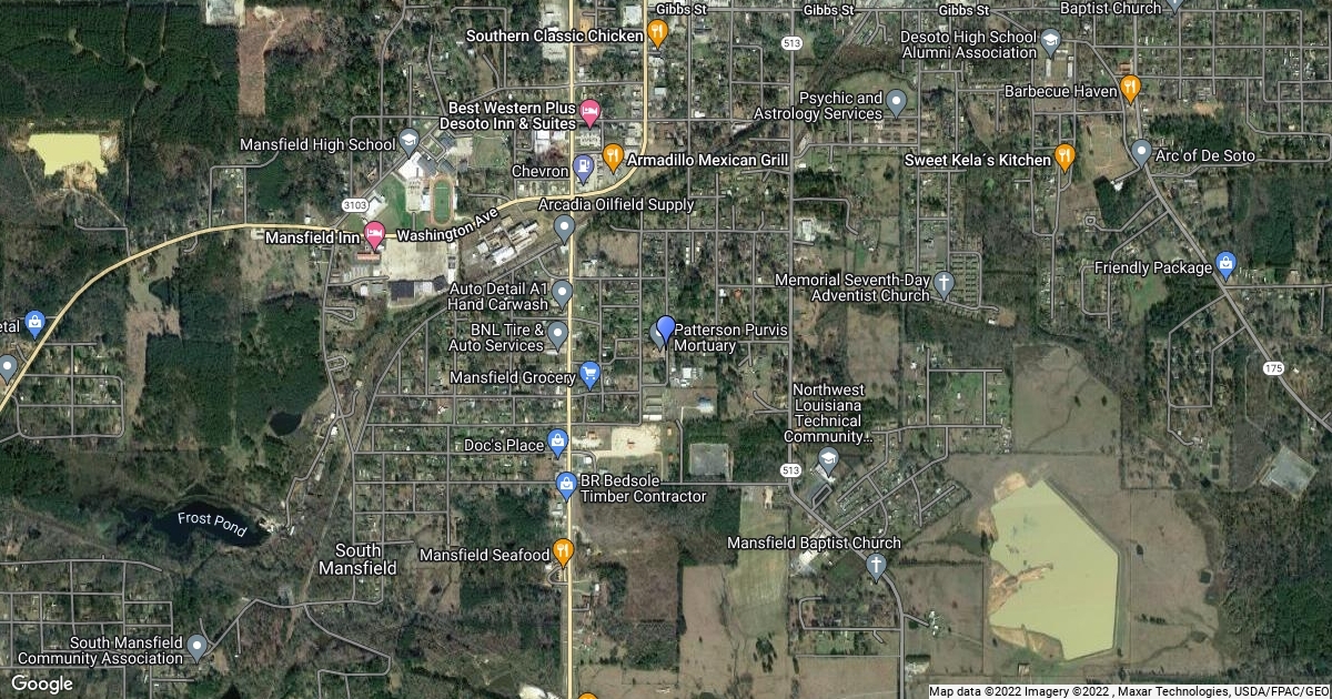 Address: 2238 Whaley St, Mansfield, LA 71052, USA Phone: 318-872-6789 Fax: 318-871-5678 Website: http://pattersonpurvismortuary.com Google+: https://plus.google.com/109807918564152942342