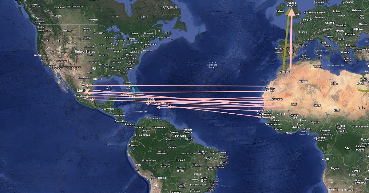 Map showing the movements of people, mainly slaves, in the Columbian Exchange.