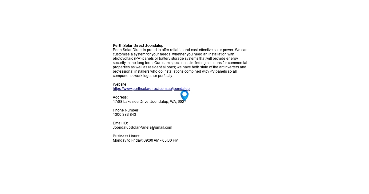 Perth Solar Direct is proud to offer reliable and cost-effective solar power. We can customise a system for your needs, whether you need an installation with photovoltaic (PV) panels or battery storage systems that will provide energy security in the long term. Our team specialises in finding solutions for commercial properties as well as residential ones; we have both state of the art inverters and professional installers who do installations combined with PV panels so all components work together perfectly. Website: https://www.perthsolardirect.com.au/joondalup Address: 17/88 Lakeside Drive, Joondalup, WA, 6027 Phone Number: 1300 383 843 Email ID: [email protected] Business Hours: Monday to Friday: 09:00 AM - 05:00 PM