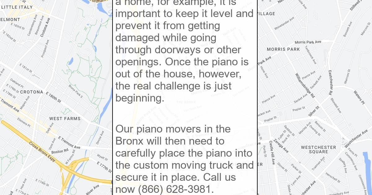 Anyone who is planning on moving their piano in the Bronx will want to make sure they have an experienced mover who can work for them. Having access to experienced piano movers in the Bronx is so important because unlike most other things people own, a piano needs to have special care at every step of the move. When removing a piano from a home, for example, it is important to keep it level and prevent it from getting damaged while going through doorways or other openings. Once the piano is out of the house, however, the real challenge is just beginning.