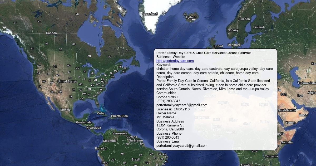 Business Website http://porterdaycare.com Keywords christian home day care, day care eastvale, day care jurupa valley, day care norco, day care corona, day care ontario, childcare, home day care Description Porter Family Day Care in Corona, California, is a California State licensed and California State subsidized loving, clean in-home child care provider serving South Ontario, Norco, Riverside, Mira Loma and the Jurupa Valley Communities. Corona 92880 (951) 280-3043 [email protected] License #: 334842118 Owner Name Mr Melanie Business Address 13351 Kamelia St. Corona, Ca 92880 Business Phone (951) 280-3043 Business Email [email protected]
