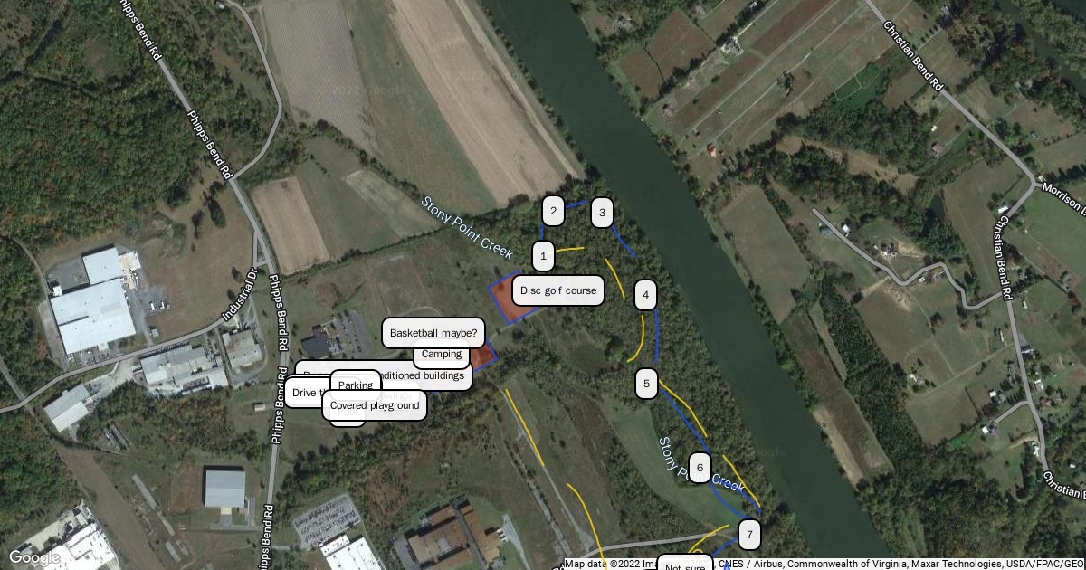 Pool, covered (pole barn with fence) playground, maybe daycare or campground according to sound from forge and plants. Small drive through restaurant and office. Disc golf course could also be pay $5 and van life parking $5 or $20 for 5 days, play all day, near entrance of course. Camping spots also available for tents near river. Bikes, tubes, and kayaks can be rented. With pay for pool,camp,disc golf, rentals, and small food service around plants could be sustainable all year. This is just a fresh rough draft and idea only.