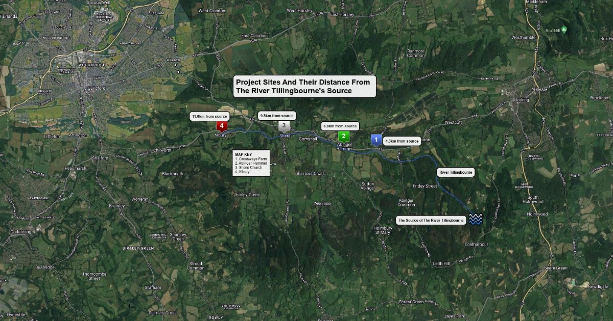 Sites along river tillingbourne and their distance from the source