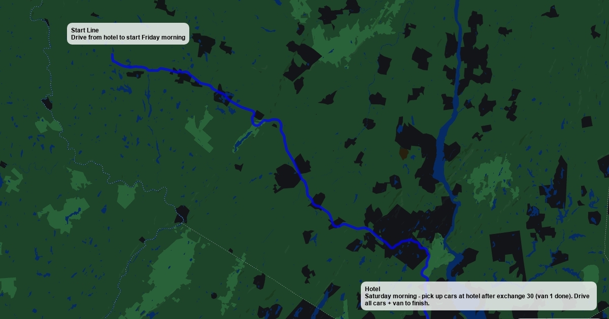 Thursday Night (meet at hotel): NYC -> Hotel Friday Morning (drive to start): Hotel -> Start The Race (not driving this route): Start -> Hotel Saturday Morning(pick up cars at hotel) Hotel -> Finish