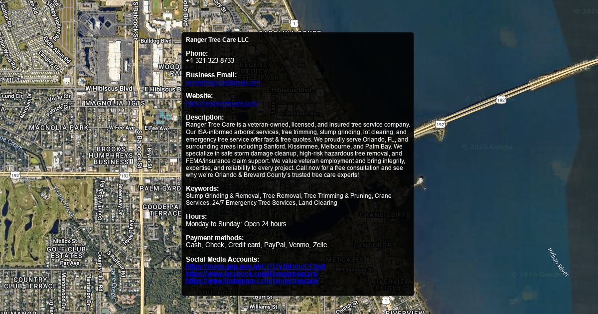 Ranger Tree Care is a veteran‑owned, licensed, and insured tree service company. Our ISA‑informed arborist services, tree trimming, stump grinding, lot clearing, and emergency tree service offer fast & free quotes. We proudly serve Orlando, FL, and surrounding areas including Sanford, Kissimmee, Melbourne, and Palm Bay. We specialize in safe storm damage cleanup, high‑risk hazardous tree removal, and FEMA/insurance claim support. We value veteran employment and bring integrity, expertise, and reliability to every project. Call now for a free consultation and see why we’re Orlando & Brevard County’s trusted tree care experts!