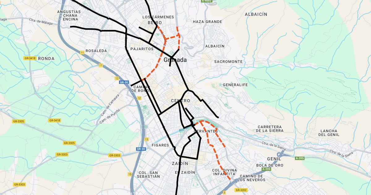 El Ayuntamiento de Granada contempla dos fases: la 1ª fase (color negro) discurre por las grandes calles y avenidas de la ciudad, casi 42 kilometros. La 2ª fase (en rojo) incluye calles con una distancia próxima a los 10 kilómetros. En total, 51,7 kilómetros donde el peatón se desenvuelve mejor entre ell tráfico de vehículos.
