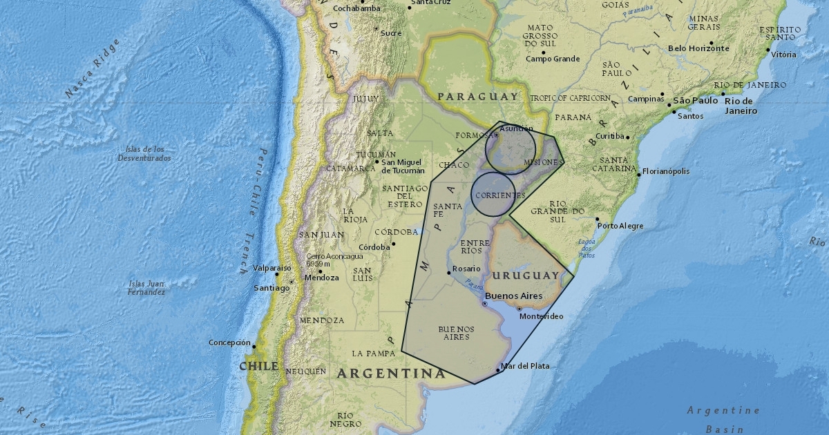 A Map of the Rioplatense Macrovariety, with the Paraguayan variety in the north and the Correntino variety in the center.