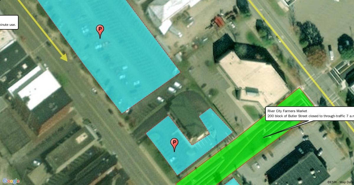 Parking and reroute map for downtown Saturday street closures.