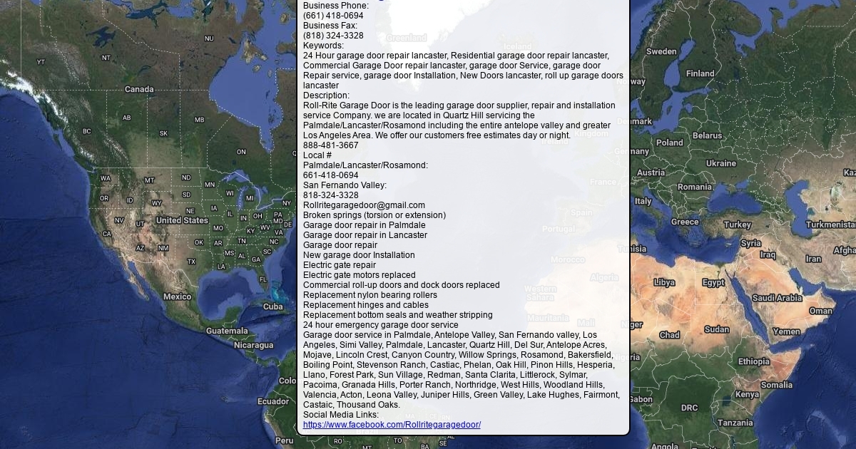 Roll-Rite Garage Door is the leading garage door supplier, repair and installation service Company. we are located in Quartz Hill servicing the Palmdale/Lancaster/Rosamond including the entire antelope valley and greater Los Angeles Area. We offer our customers free estimates day or night.