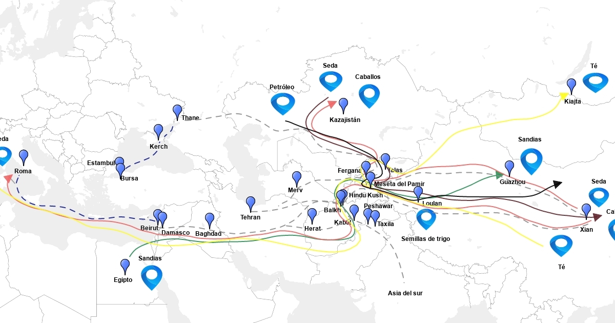 Este mapa interactivo muestra, de manera resumida, los lugares más relevantes, las rutas y el flujo de las principales mercancías comercializadas en la gran ruta que conecta a Eurasia.