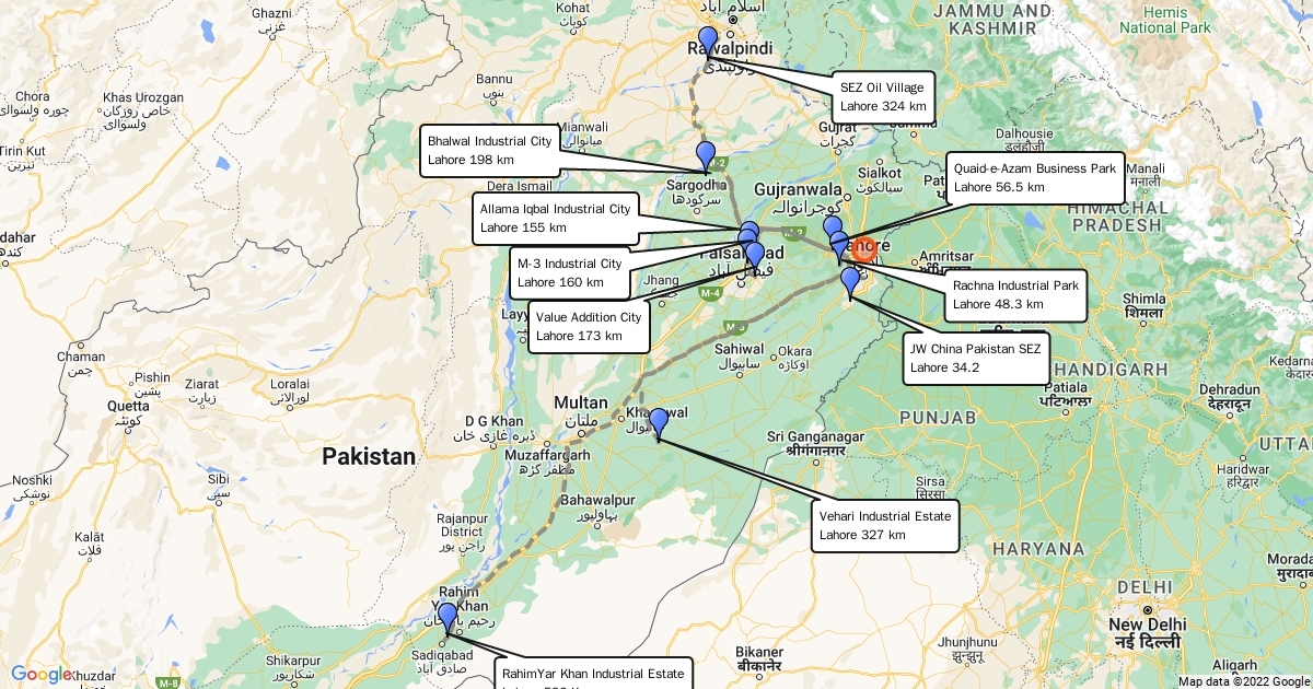 sez locations are marked with their respective distances from lahore city