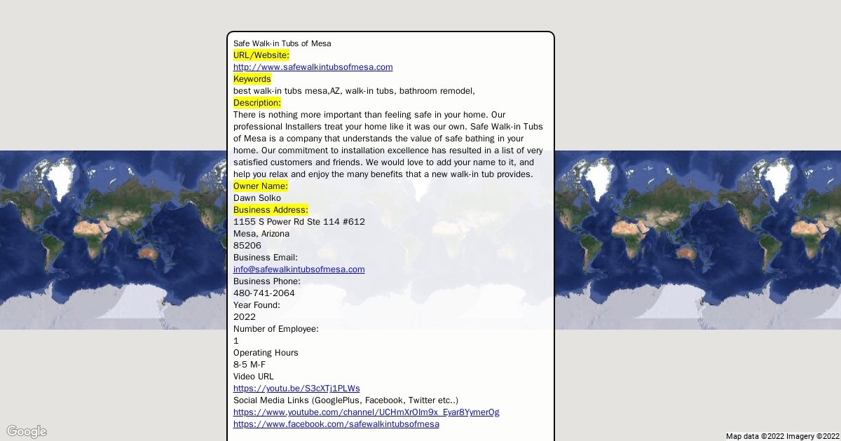 URL/Website: http://www.safewalkintubsofmesa.com Keywords best walk-in tubs mesa,AZ, walk-in tubs, bathroom remodel, Description: There is nothing more important than feeling safe in your home. Our professional Installers treat your home like it was our own. Owner Name: Dawn Solko Business Address: 1155 S Power Rd Ste 114 #612 Mesa, Arizona 85206 Business Email: [email protected] Business Phone: 480-741-2064 Year Found: 2022 Number of Employee: 1 Operating Hours 8-5 M-F Video URL https://youtu.be/S3cXTj1PLWs Social Media Links (GooglePlus, Facebook, Twitter etc..) https://www.youtube.com/channel/UCHmXrOIm9x_Eyar8YymerOg https://www.facebook.com/safewalkintubsofmesa