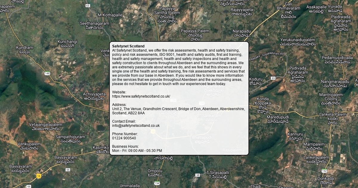 At Safetynet Scotland, we offer fire risk assessments, health and safety training, policy and risk assessments, ISO 9001, health and safety audits, first aid training, health and safety management, health and safety inspections and health and safety construction to clients throughout Aberdeen and the surrounding areas. We are extremely passionate about what we do, and we feel that this shows in every single one of the health and safety training, fire risk assessments and services that we provide from our base in Aberdeen. If you would like to know more information on the services that we provide throughout Aberdeen and the surrounding areas, please do not hesitate to get in touch with our experienced team today. Website: https://www.safetynetscotland.co.uk/ Address: Unit 2, The Venue, Grandholm Crescent, Bridge of Don, Aberdeen, Aberdeenshire, Scotland, AB22 8AA Contact Email: [email protected] Phone Number: 01224 900540 Business Hours: Mon - Fri: 09:00 AM - 05:30 PM