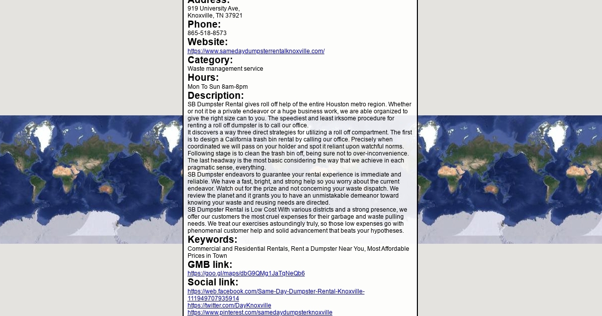 Address: 919 University Ave, Knoxville, TN 37921 Phone: 865-518-8573 Website: https://www.samedaydumpsterrentalknoxville.com/ Category: Waste management service Hours: Mon To Sun 8am-8pm
