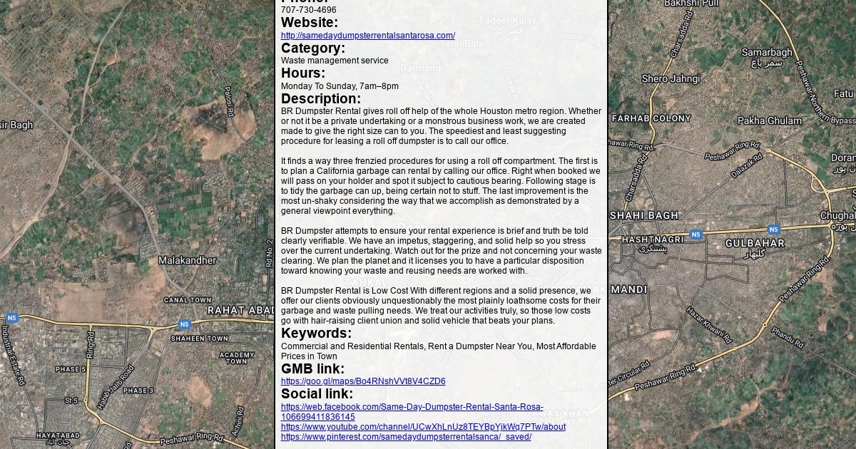 Address: 1820 Terry Rd, Santa Rosa, CA 95403 Phone: 707-730-4696 Website: http://samedaydumpsterrentalsantarosa.com/ Category: Waste management service