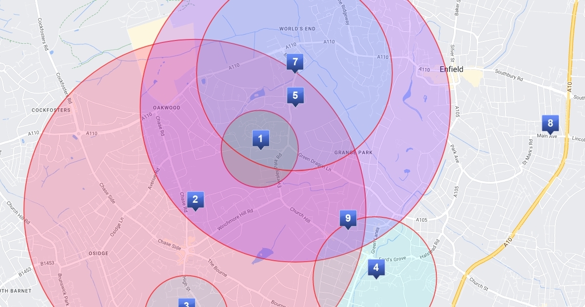 Each circle shows the approximate radius that would have ensured entry into the school in each of the last 5 years