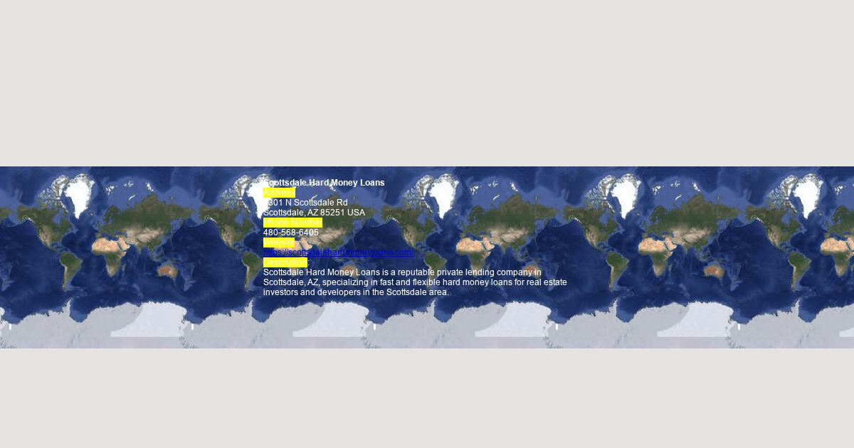 Address 4301 N Scottsdale Rd Scottsdale, AZ 85251 USA Phone Number 480-568-6405 Website https://scottsdalehardmoneyloans.com/ Description: Scottsdale Hard Money Loans is a reputable private lending company in Scottsdale, AZ, specializing in fast and flexible hard money loans for real estate investors and developers in the Scottsdale area.