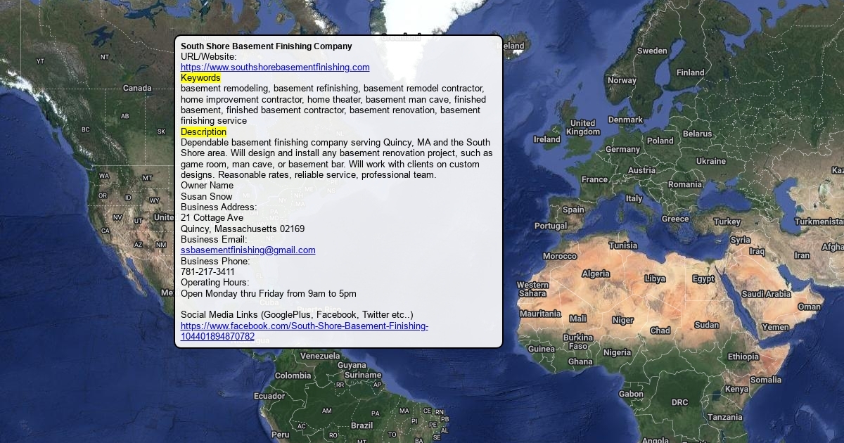 URL/Website: https://www.southshorebasementfinishing.com Keywords basement remodeling, basement refinishing, basement remodel contractor, home improvement contractor, home theater, basement man cave, finished basement, finished basement contractor, basement renovation, basement finishing service Description Dependable basement finishing company serving Quincy, MA and the South Shore area. Will design and install any basement renovation project, such as game room, man cave, or basement bar. Will work with clients on custom designs. Reasonable rates, reliable service, professional team. Owner Name Susan Snow Business Address: 21 Cottage Ave Quincy, Massachusetts 02169 Business Email: [email protected] Business Phone: 781-217-3411 Operating Hours: Open Monday thru Friday from 9am to 5pm ¬ Social Media Links (GooglePlus, Facebook, Twitter etc..) https://www.facebook.com/South-Shore-Basement-Finishing-104401894870782