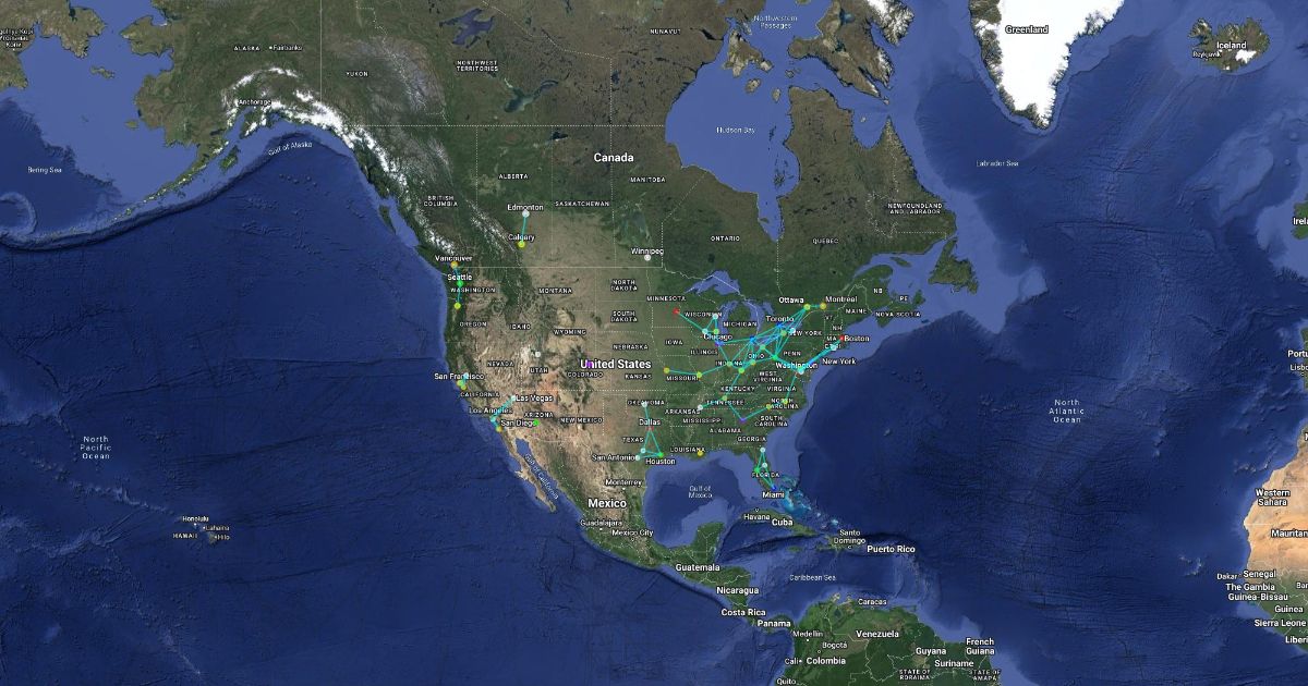 Cities based on sport teams and 400,000 square km radius.