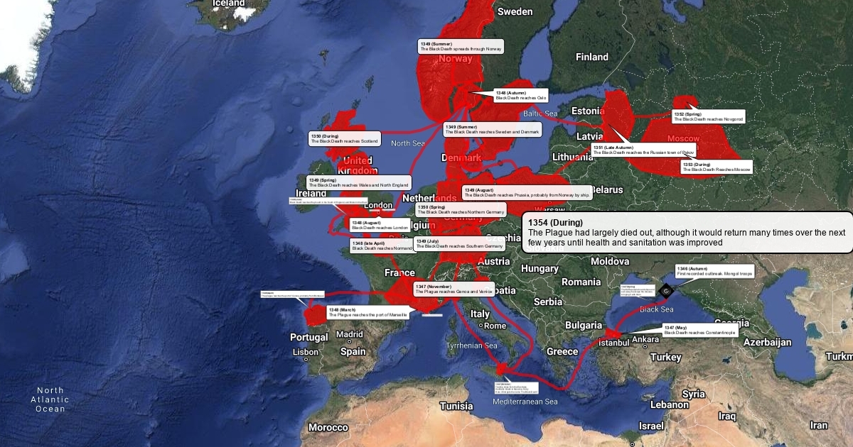 A map representing the spread of the Black Death plague from 1346 to 1354. Made quickly for a school activity.