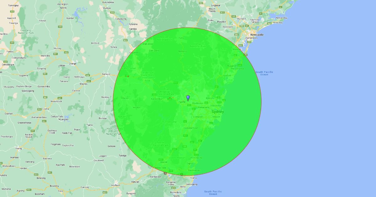 detail 100klm radius from yard
