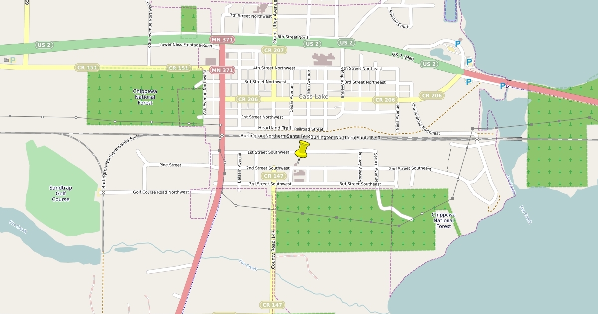 The Cass Lake city border is the red dotted line. The Leech Lake Band of Ojibwe Reservation is any land outside the city border (excluding National Forest land)