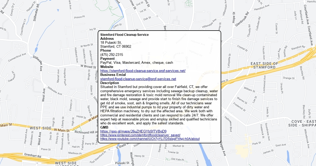 Situated in Stamford but providing cover all over Fairfield, CT, we offer comprehensive emergency services including sewage backup cleanup, water and fire damage restoration & toxic mold removal We clean-up contaminated water, black mold, sewage and provide start to finish fire damage services to get rid of smoke, soot, ash & lingering smells. All of our technicians wear PPE and we use industrial pumps to rid your property of dirty water and HEPA filtration machinery, to dry out the affected area. We work both with commercial and residential clients and can respond to calls 24/7. We offer expert help at reasonable prices and employ skilled and qualified technicians who do excellent work, and apply the safest standards.