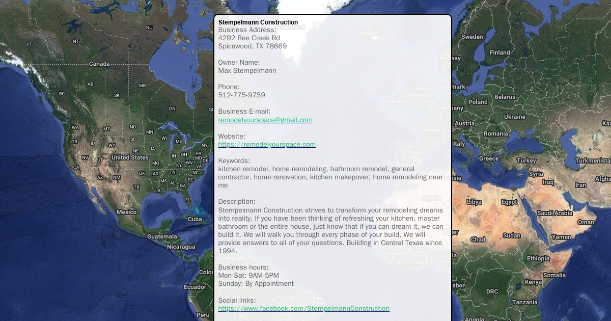 Business Address: 4292 Bee Creek Rd Spicewood, TX 78669 Owner Name: Max Stempelmann Phone: 512-775-9759 Business E-mail: [email protected] Website: https://remodelyourspace.com Keywords: kitchen remodel, home remodeling, bathroom remodel, general contractor, home renovation, kitchen makepover, home remodeling near me Description: Stempelmann Construction strives to transform your remodeling dreams into reality. If you have been thinking of refreshing your kitchen, master bathroom or the entire house, just know that if you can dream it, we can build it. We will walk you through every phase of your build. We will provide answers to all of your questions. Building in Central Texas since 1994. Business hours: Mon-Sat: 9AM-5PM Sunday: By Appointment Social links: https://www.facebook.com/StempelmannConstruction Payment Method: Cash, Credit Card