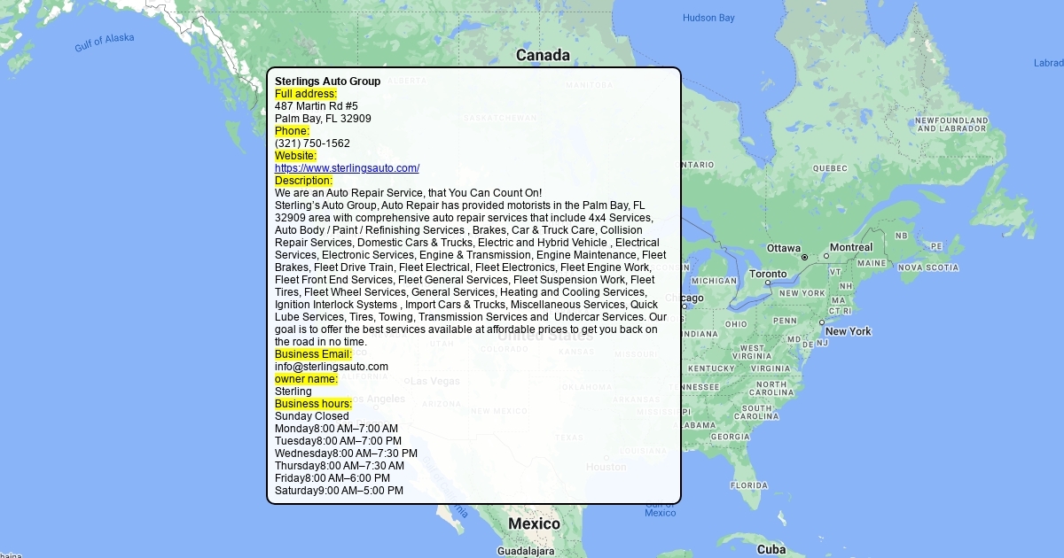 Sterling’s Auto Group, Auto Repair has provided motorists in the Palm Bay, FL 32909 area with comprehensive auto repair services that include 4x4 Services, Auto Body / Paint / Refinishing Services , Brakes, Car & Truck Care, Collision Repair Services, Domestic Cars & Trucks, Electric and Hybrid Vehicle , Electrical Services, Electronic Services, Engine & Transmission, Engine Maintenance, Fleet Brakes, Fleet Drive Train, Fleet Electrical, Fleet Electronics, Fleet Engine Work, Fleet Front End Services, Fleet General Services, Fleet Suspension Work, Fleet Tires, Fleet Wheel Services, General Services, Heating and Cooling Services, Ignition Interlock Systems , Import Cars & Trucks, Miscellaneous Services, Quick Lube Services, Tires, Towing, Transmission Services and Undercar Services. Our goal is to offer the best services available at affordable prices to get you back on the road in no time.