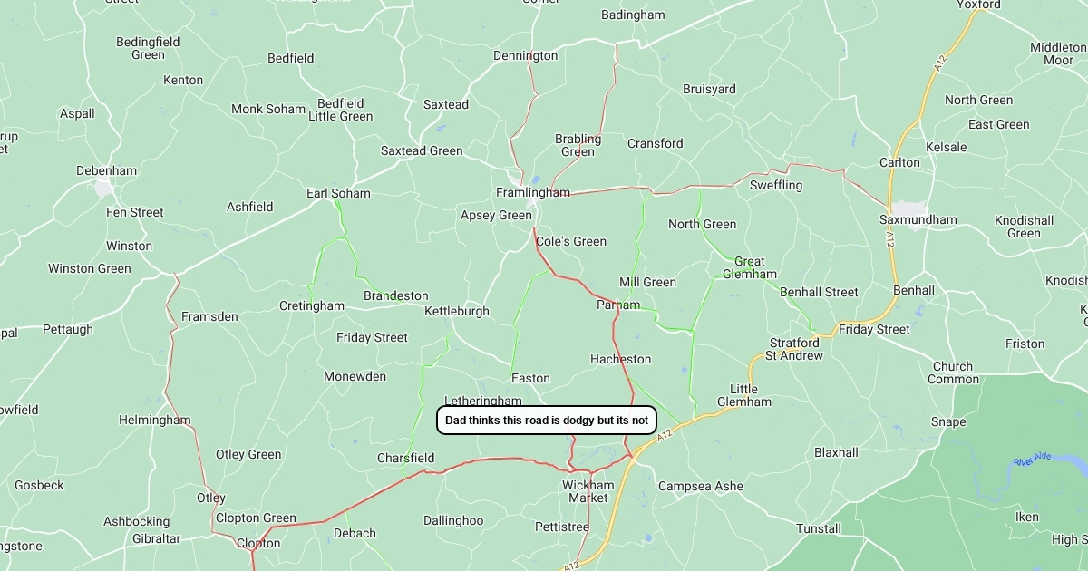 Most of Suffolk colour coded for road safety. Use to plan running or cycling routes.