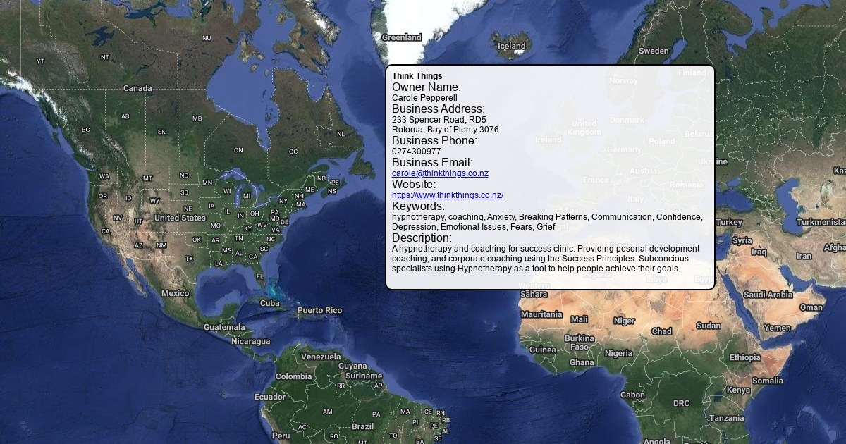 Owner Name: Carole Pepperell Business Address: 233 Spencer Road, RD5 Rotorua, Bay of Plenty 3076 Business Phone: 0274300977 Business Email: [email protected] Website: https://www.thinkthings.co.nz/ Keywords: hypnotherapy, coaching, Anxiety, Breaking Patterns, Communication, Confidence, Depression, Emotional Issues, Fears, Grief Description: A hypnotherapy and coaching for success clinic. Providing pesonal development coaching, and corporate coaching using the Success Principles. Subconcious specialists using Hypnotherapy as a tool to help people achieve their goals.