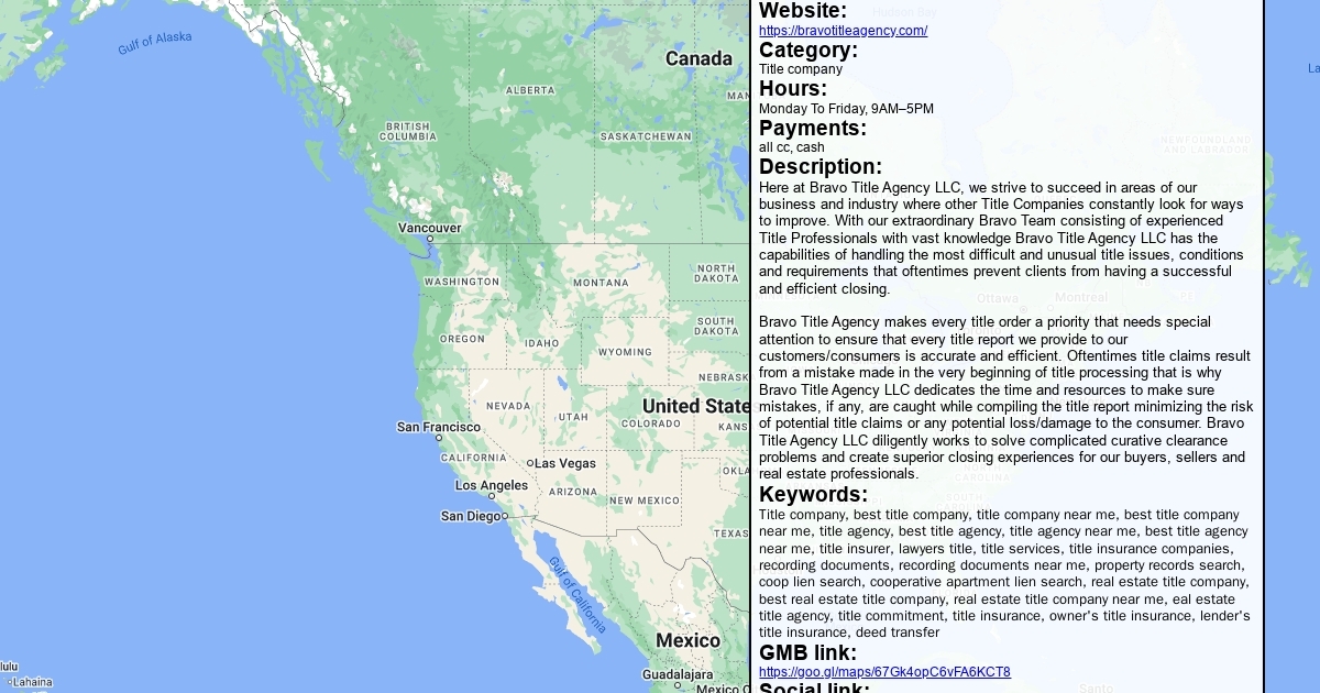 Address: 614 Warburton Ave, Yonkers, NY 10701 Phone: (914) 240-8179 Website: https://bravotitleagency.com/ Category: Title company