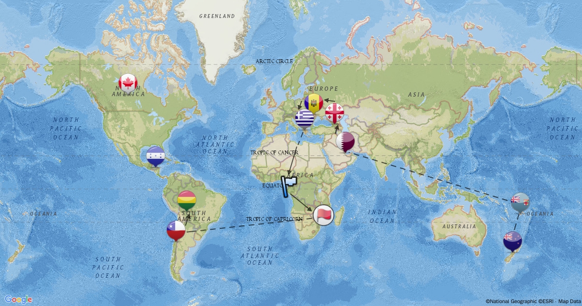 A travel route around the world, visting two countries (One MEDC and another LEDC) per continent.