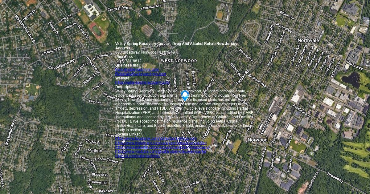 Address: 830 Broadway, Norwood, NJ 07648 Phone no: (201) 781-8812 Business mail: [email protected] [email protected] Website: https://valleyspringrecovery.com/ Description: Valley Spring Recovery Center (VSRC) in Norwood, NJ, offers compassionate, evidence-based addiction and mental health treatment to individuals from New Jersey, New York, and surrounding areas. Our licensed clinicians provide dual diagnosis support, addressing substance use and co-occurring disorders like anxiety, depression, and PTSD. We offer multiple levels of care including Partial Hospitalization (PHP) and Intensive Outpatient (IOP). VSRC is accredited by CARF International and licensed by the New Jersey Department of Children and Families (NJ DCF). We accept most major insurance plans, including Aetna, Cigna, UnitedHealthcare, and Blue Cross Blue Shield, ensuring accessible care for those ready to recover. Socials Links: https://www.facebook.com/ValleySpringRecovery https://www.instagram.com/
