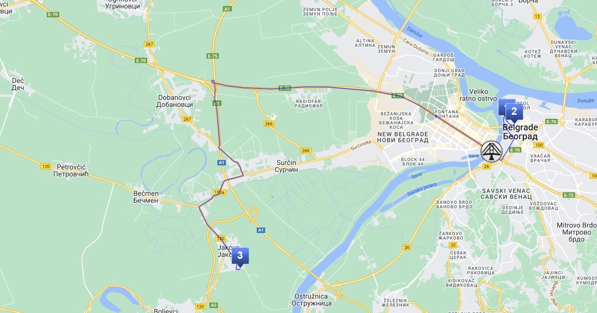Пут од моста Газела до цркве (1) и паркинг гараже (2), и обратна траса (истим путем) до ресторана у Јакову (3).