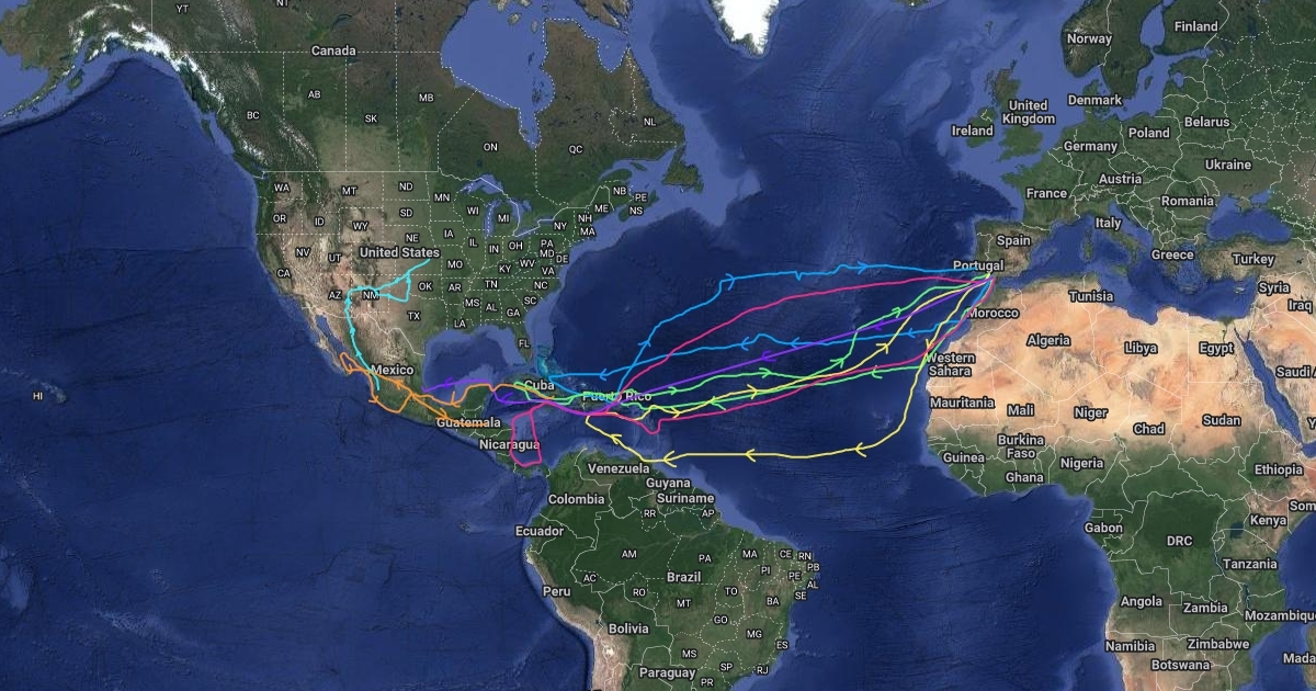map about 3 different Spanish explorers 'discovering' the Americas and conquering the Aztec and other tribal Americans