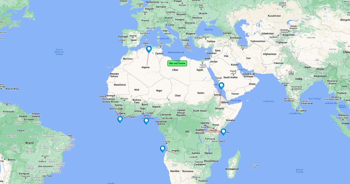 All the countries in Africa affected by war which creates famine or vise versa