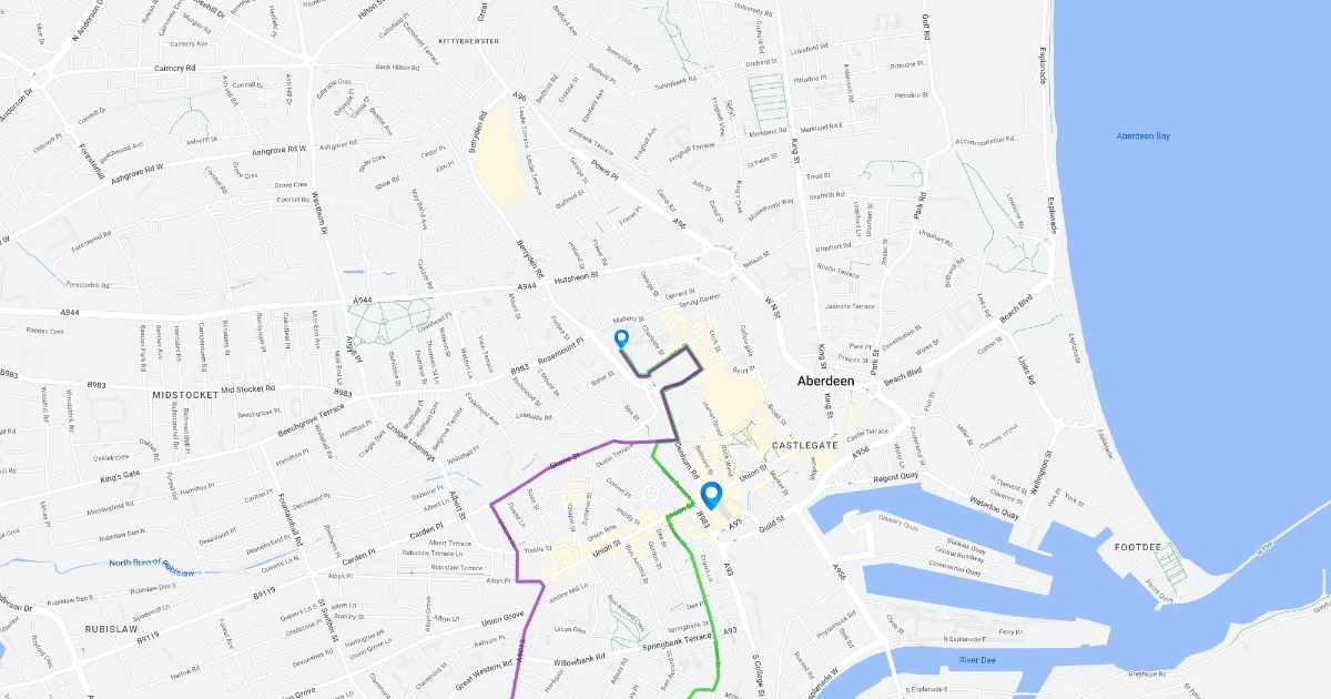 Via the Deeside Railway Line (green) or Broomhill Road (purple)