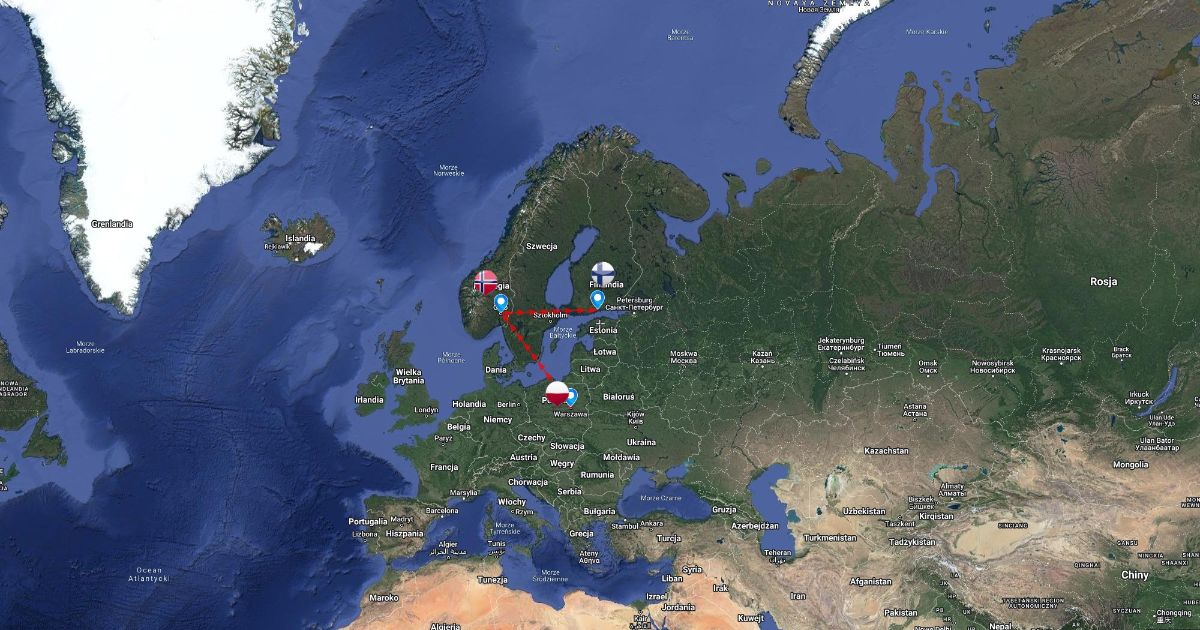 Mapa opisuje trasę lotu wycieczki zabierającej nas z Warszawy do Oslo a potem do Helsinek.