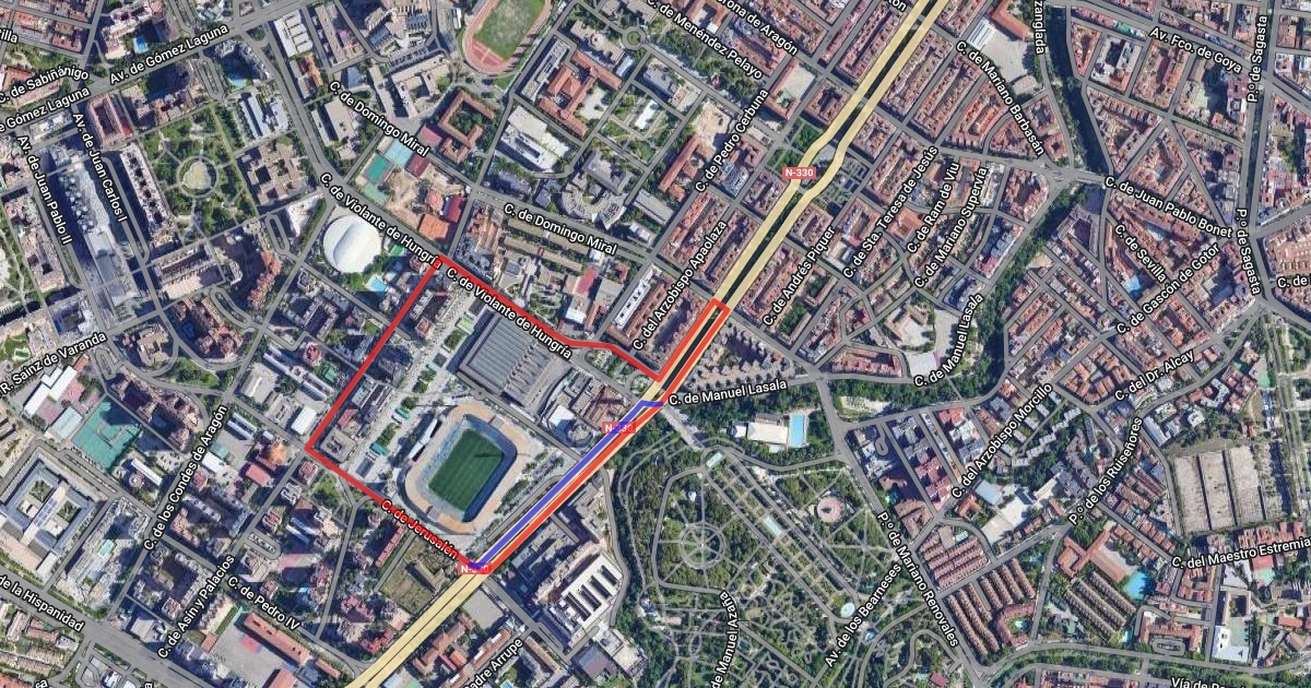 Linear track surrounding La Romareda and passing beside the botanical garden