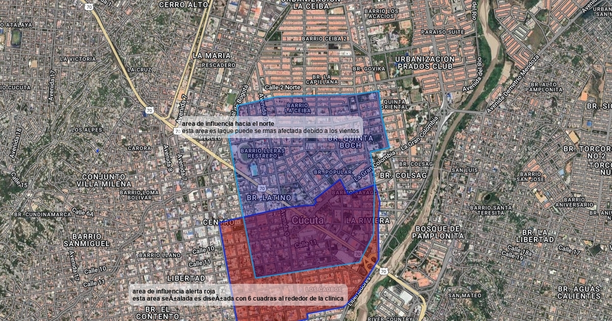 este mapa representa la alerta roja que se esta presentando en la clinca san jose y sus alrededores