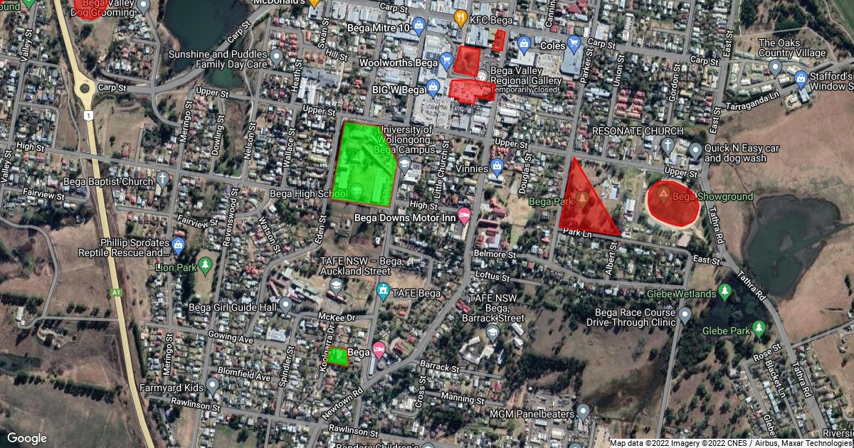 a map of bega with all the rec and schools hilitid
